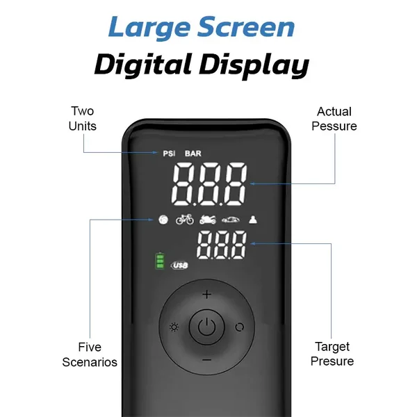 Premium digital air compressor for electric scooters, bikes, and more. Compact, USB-C rechargeable, with LED light, powerbank and 150 PSI pressure.